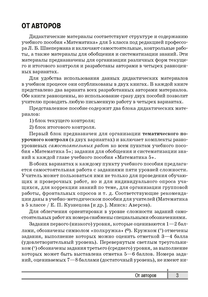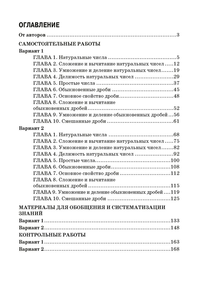 Пособие содержит обучающие самостоятельные работы, расширенные контрольные работы по курсу математики 5 класса и итоговую контрольную работу. Все материалы разработаны в четырех равноценных вариантах: в двух книгах, по два варианта в каждой.