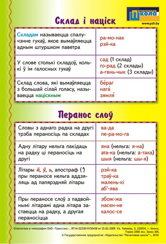 Наглядныя дапаможнікі зручнага для выкарыстання ў індывідуальнай працы памеру будуць карыснымі для вучняў пачатковай школы на ўроках беларускай мовы і пры выкананні дамашніх заданняў. Памер 15x21