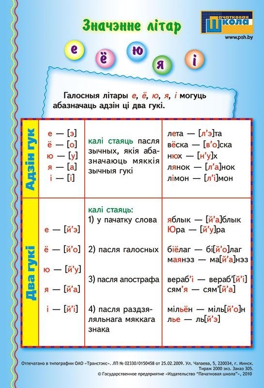 Наглядное пособие. Значэнне літар е, ё, ю, я, і / Склад і націск