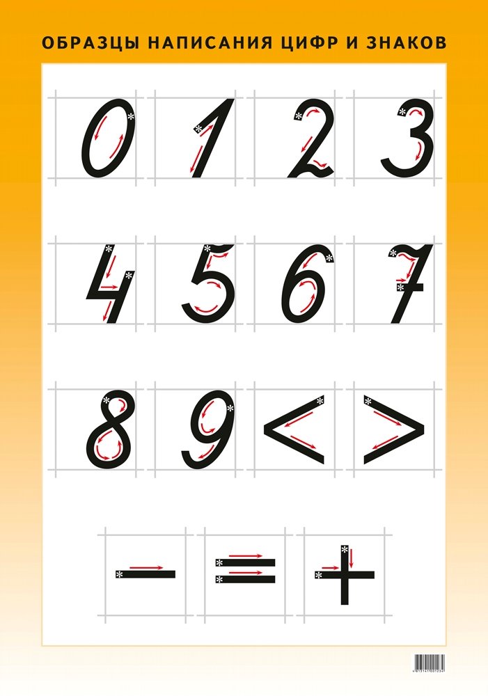 Наглядное пособие представляет собой картонный лист с образцами написания цифр и знаков. Его можно повесить в классе или дома.