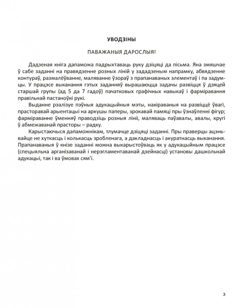 Вучэбны наглядны дапаможнік накіраваны на рэалізацыю задач адукацыйнай вобласці «Мастацтва» (выяўленчая дзейнасць, падрыхтоўка рукі да пісьма) вучэбнай праграмы дашкольнай адукацыі. Графічныя заданні, прапанаваныя ў дапаможніку, спрыяюць фарміраванню ў выхаванцаў старшай групы (ад 5 да 7 гадоў) пачатковых графічных навыкаў, развіццю дакладных, каардынаваных рухаў рукі, прасторавай арыентацыі, а таксама пазнавальных працэсаў (памяці, увагі, уяўлення).