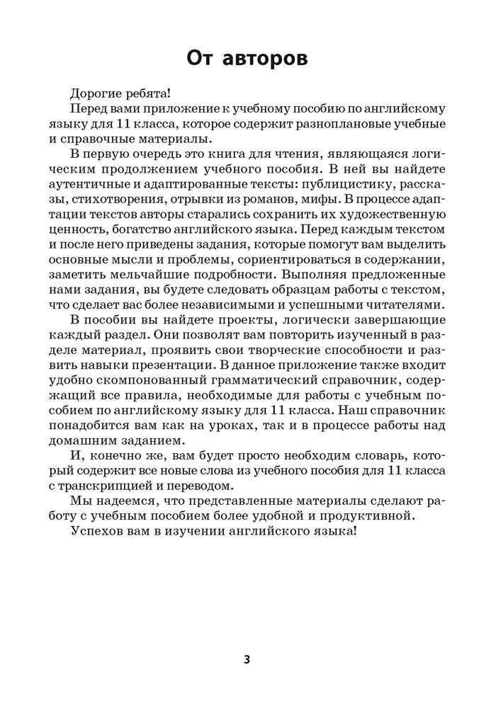 Издание является приложением к учебному пособию по английскому языку для 11 класса. В нем содержатся аутентичные и адаптированные тексты — публицистика, рассказы, стихотворения, отрывки из романов, мифы. В книгу также входят проекты, логически завершающие каждый раздел, грамматический справочник, включающий правила, необходимые для работы на уроках и дома, а также словарь, в котором собраны все новые слова из учебного пособия с транскрипцией и переводом.