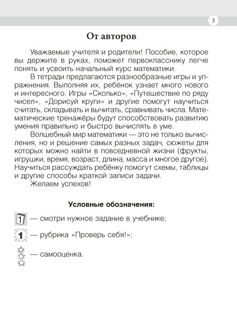 Рабочая тетрадь, подготовленная в двух частях, является приложением к учебному пособию «Моя математика. 1 класс» В. Д. Герасимова. Она поможет учащимся легче усвоить и закрепить программный материал по математике, а учителю — организовать работу первоклассников как на уроке, так и дома. Представленные в тетради игры и упражнения будут способствовать развитию у школьников памяти, логического мышления, умения быстро и правильно вычислять в уме.