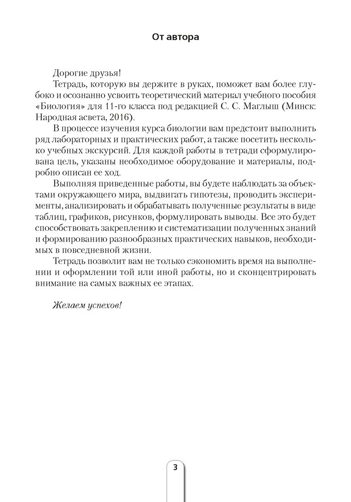 Тетрадь для лабораторных и практических работ по биологии для 11 класса подготовлена в полном соответствии с учебной программой для повышенного уровня (2016) и учебным пособием «Биология» для 11 класса учреждений общего среднего образования с русским языком обучения (авторы С. С. Маглыш, А. Е. Каревский).