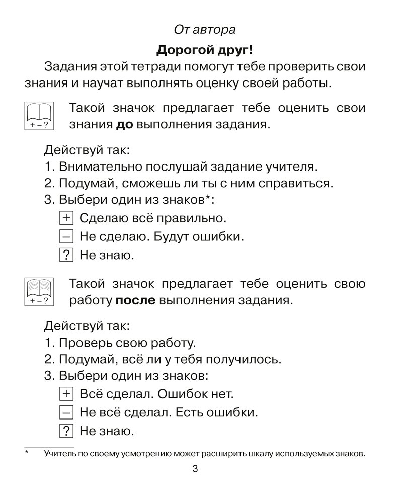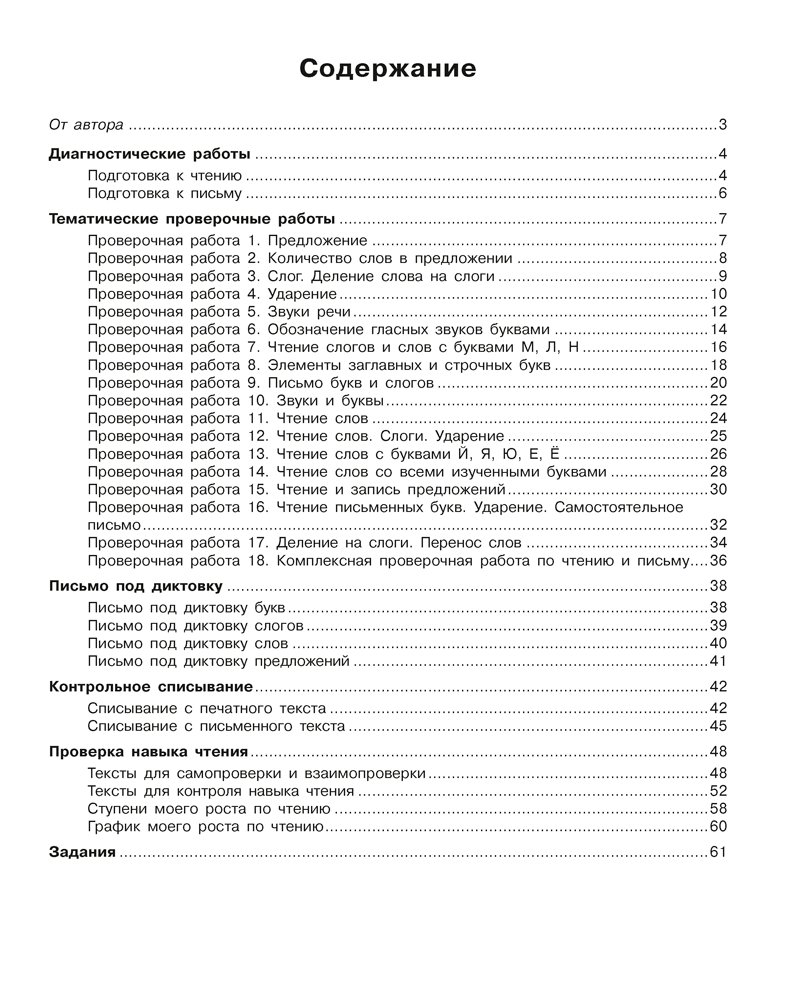 Тетрадь предназначена для индивидуальных занятий учеников и содержит диагностические работы, тематические проверочные работы, тексты для контрольного списывания с линейками для записи, тексты для проверки навыка чтения. Для каждой работы предусмотрена система самооценки. В конце приведены краткие методические рекомендации для учителя по выполнению заданий.