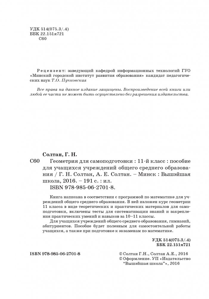 В данном учебнике изложен курс геометрии 11 класса в виде теоретических и практических материалов для самоподготовки, включены тесты для систематизации знаний и закрепления практических умений и навыков за 10–11 классы.