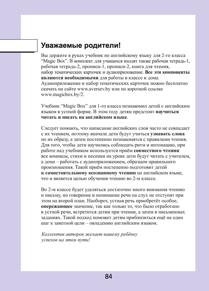 Книга для ученика является составной частью учебно-методического комплекса «Волшебная шкатулка» для 2-го класса, в который также входят рабочая тетрадь-1, рабочая тетрадь-2, прописи-1, прописи-2, книга для чтения, книга для учителя, аудиоприложение, набор тематических карточек. Аудиоприложение, набор тематических карточек и книгу для учителя на русском или английском языках, а также интерактивные учебники для Android и iOS и приложения с дополненной реальностью для Android и iOS можно скачать по ссылкам и на сайте издательства "Аверсэв".