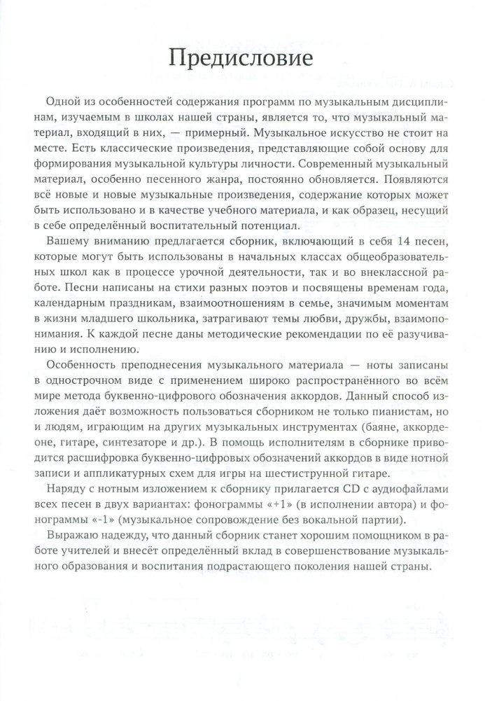 Пособие для учителей учреждений общего среднего образования с белорусским и русским языками обучения. Сборник включает 14 песен, которые могут быть использованы в начальной школе как на уроках, так и во внеклассной работе. К каждой песне даны методические рекомендации по её разучиванию и исполнению. В пособии используются буквенно-цифровые обозначения аккордов, что позволит работать со сборником не только пианистам, но и людям, играющим на других музыкальных инструментах (баяне, аккордеоне, гитаре и др.). Адресуется учителям музыки, начальных классов, руководителям детских хоровых коллективов и вокальных ансамблей. – 40 с., мягкий переплет