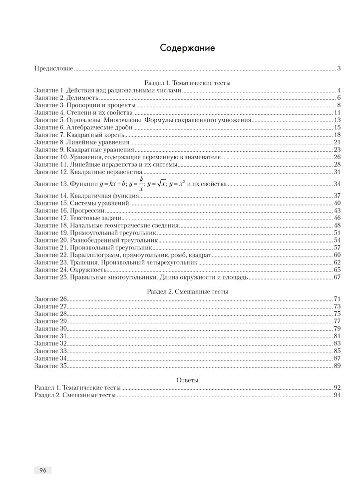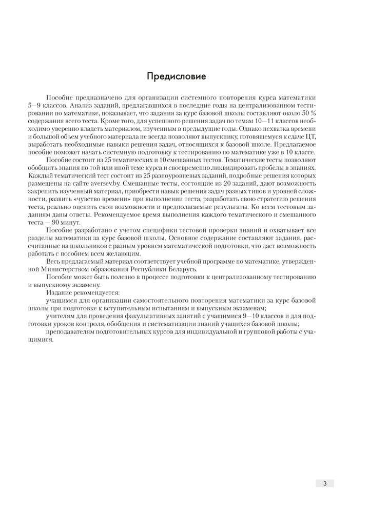 Пособие соответствует учебной программе и предназначено для организации системного повторения математики за курс базовой школы на факультативных занятиях и самостоятельно при подготовке к выпускному экзамену и централизованному тестированию. Адресуется учащимся, абитуриентам, а также учителям и преподавателям подготовительных курсов. Для повышения эффективности работы рекомендуется использовать пособие совместно с электронными материалами, где предложены подробные решения к тематическим тестам. Вы можете скачать решение тематических тестов к пособию на нашем сайте. Рецензент: учитель математики квалификационной категории «учитель-методист» лицея Белорусского национального технического университета О. Е. Цыбулько