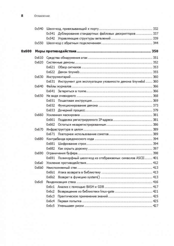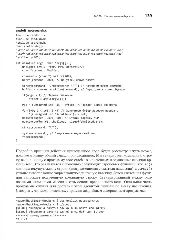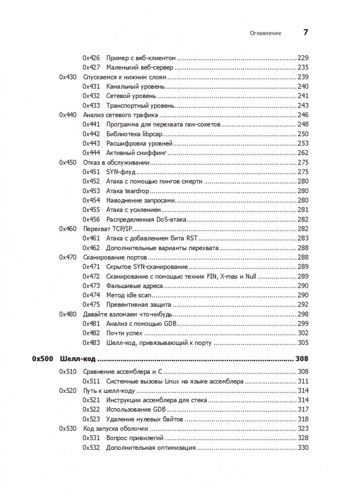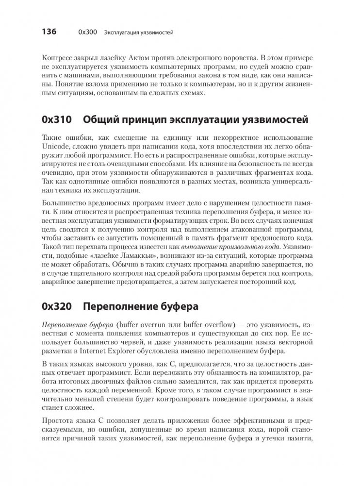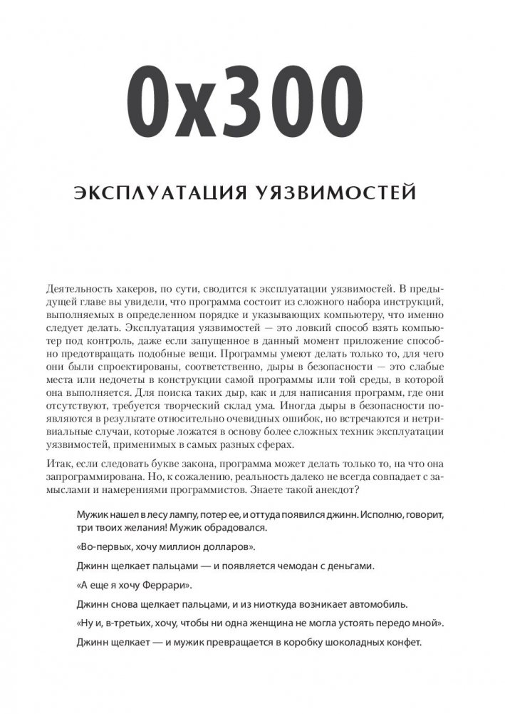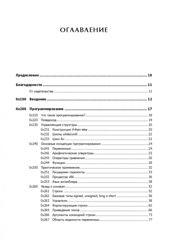 Каждый программист по сути своей — хакер. Ведь первоначально хакингом называли поиск искусного и неочевидного решения. Понимание принципов программирования помогает находить уязвимости, а навыки обнаружения уязвимостей помогают создавать программы, поэтому многие хакеры занимаются тем и другим одновременно. Интересные нестандартные ходы есть как в техниках написания элегантных программ, так и в техниках поиска слабых мест. С чего начать? Чтобы перезаписывать память с помощью переполнения буфера, получать доступ к удаленному серверу и перехватывать соединения вам предстоит программировать на Си и ассемблере, использовать шелл-код и регистры процессора, познакомиться с сетевыми взаимодействиями и шифрованием и многое другое. Как бы мы ни хотели верить в чудо, программное обеспечение и компьютерные сети, от которых зависит наша повседневная жизнь, обладают уязвимостями. Мир без хакеров — это мир без любопытства и новаторских решений.