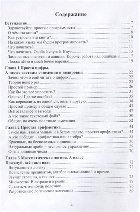 Книга простая математика в первую очередь для программистов, но не только. Для программистов в книге дано самое необходимое, то, без чего программисту будет трудно. Материал представлен в самом простом и правильном для немедленного употребления программистом изложении. Настоящее применение математики программистом начинается тогда, когда он, имея перед собой задачу, сам, без ансамбля, догадывается, какую именно отрасль математики надо для такого случая вспомнить, какой конкретно метод из неё взять и как его запрограммировать. И всё это сам, без посторонней помощи. Цель книги не в том, чтобы научить программировать математические алгоритмы. Цель в том, чтобы взять задачу и понять какой математический алгоритм к ней применить. Прочитайте и применяйте. Для не программиста эта книга - короткое введение в основы высшей математики. Особое внимание уделено базовым понятиям теории вероятностей.