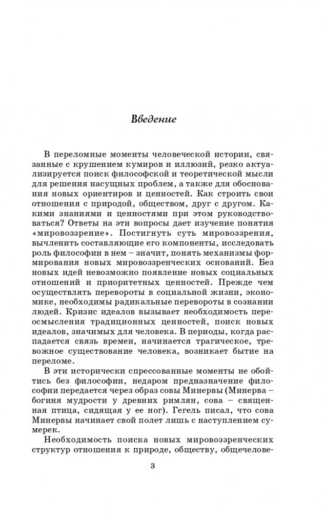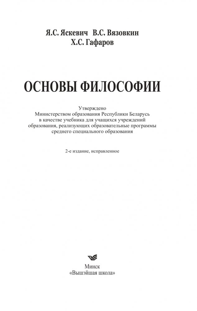 Рассматриваются сущность и содержание основных разделов философского знания (истории философии, онтологии, гносеологии, философской антропологии, социальной философии), анализируются важнейшие проблемы философии и конкретно-исторические варианты их решения. Подготовлено в соответствии с типовой учебной программой, утвержденной Министерством образования Республики Беларусь. Текст печатается по 2-му исправленному изданию (2008). Для учащихся учреждений, обеспечивающих получение среднего специального образования, а также всех интересующихся проблемами философской мысли.