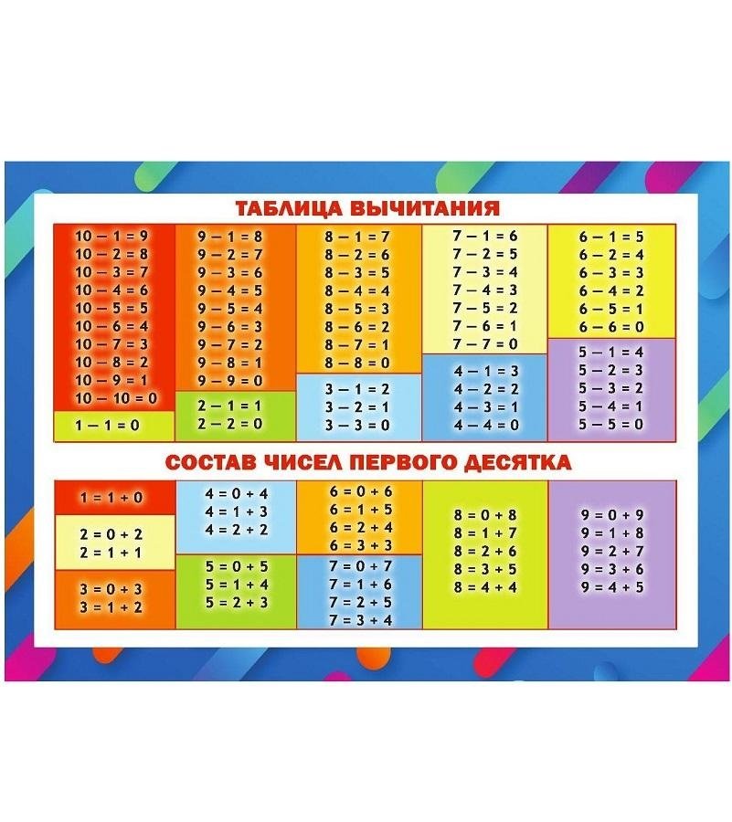 Отличное наглядное пособие для заучивания таблицы вычитания и сложения в ненавязчивой игровой форме поможет малышу быстро научиться считать в пределах десяти. Формат А5.