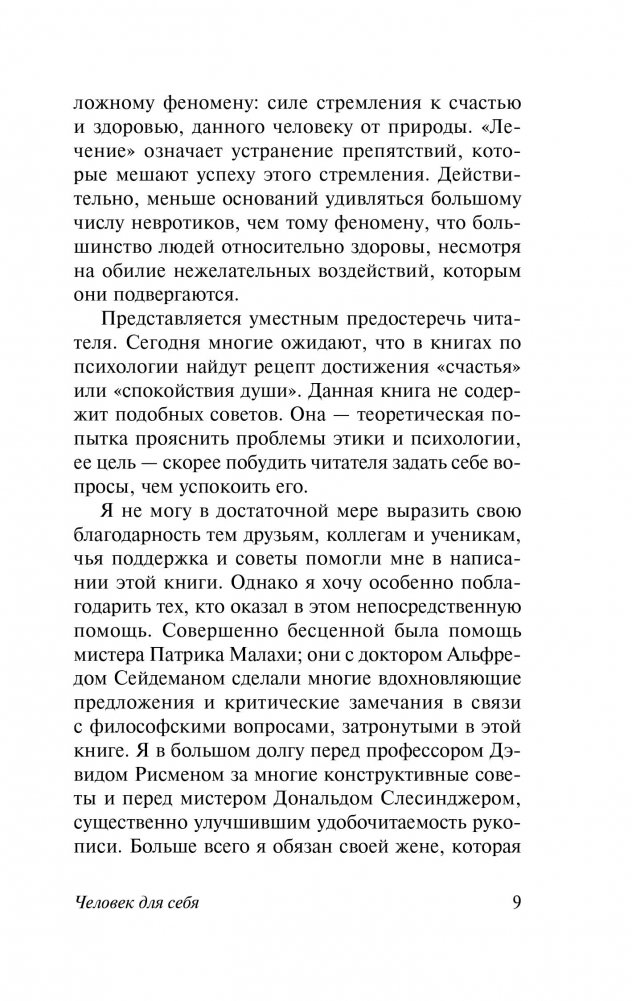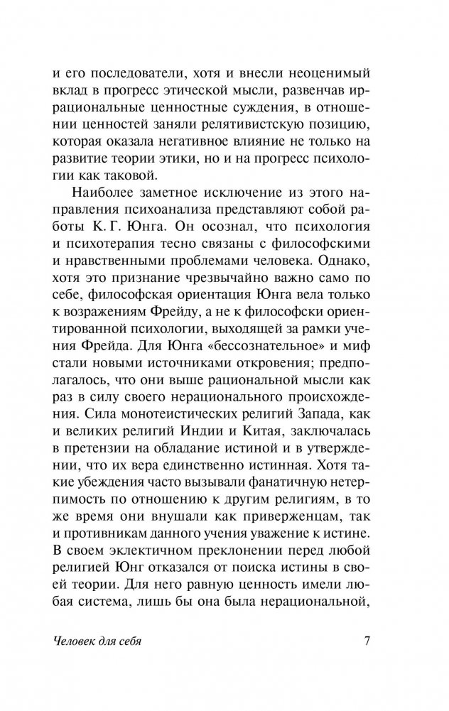 В работе «Человек для себя» Эрих Фромм рассматривает предназначение человека в современном мире, освободившем его от тяжелого физического труда. Развивая материальную культуру, человечество получило власть над природой, однако при всех своих знаниях о материи человек остался невежественен в самых важных, основополагающих вопросах человеческого бытия: что такое человек, как он должен жить и куда он может направить ту огромную энергию, что заключена в нем самом?