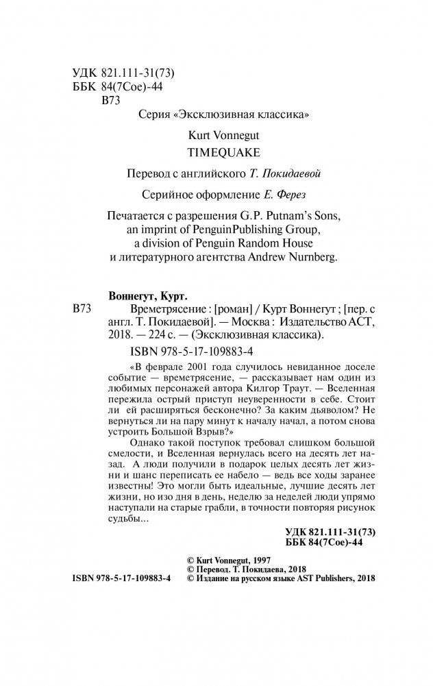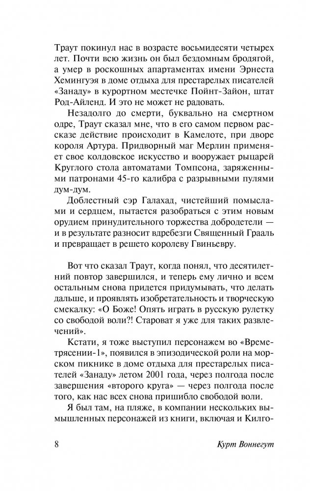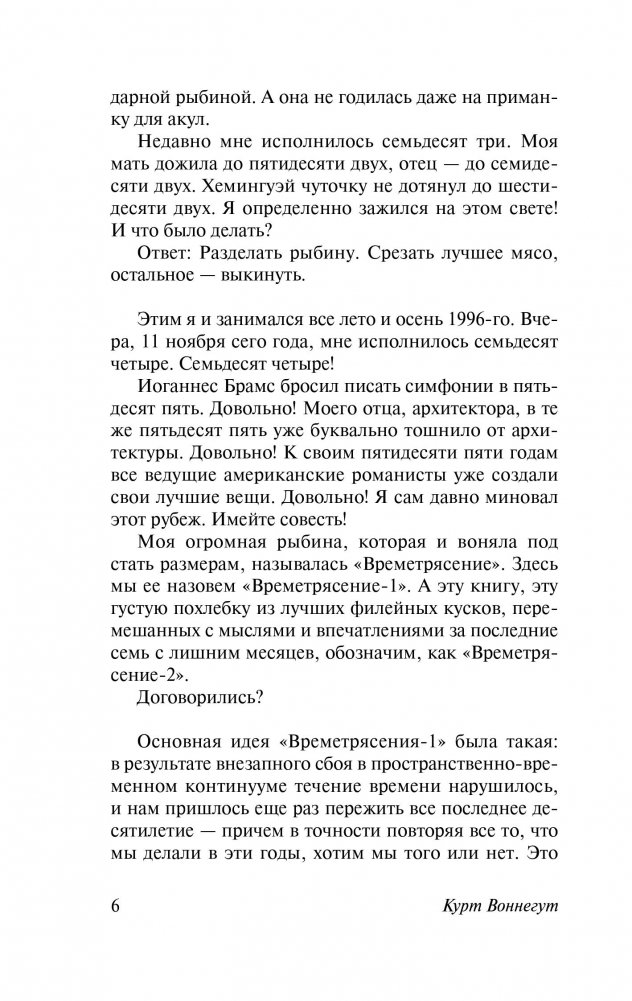 «В феврале 2001 года случилось невиданное доселе событие – времетрясение, – рассказывает нам один из любимых персонажей автора Килгор Траут. – Вселенная пережила острый приступ неуверенности в себе. Стоит ли ей расширяться бесконечно? За каким дьяволом? Не вернуться ли на пару минут к началу начал, а потом снова устроить Большой Взрыв?». Однако такой поступок требовал слишком большой смелости, и Вселенная вернулась всего на десять лет назад. А люди получили в подарок целых десять лет жизни и шанс переписать ее набело – ведь все ходы заранее известны! Это могли быть идеальные, лучшие десять лет жизни, но изо дня в день, неделю за неделей люди упрямо наступали на старые грабли, в точности повторяя рисунок судьбы…