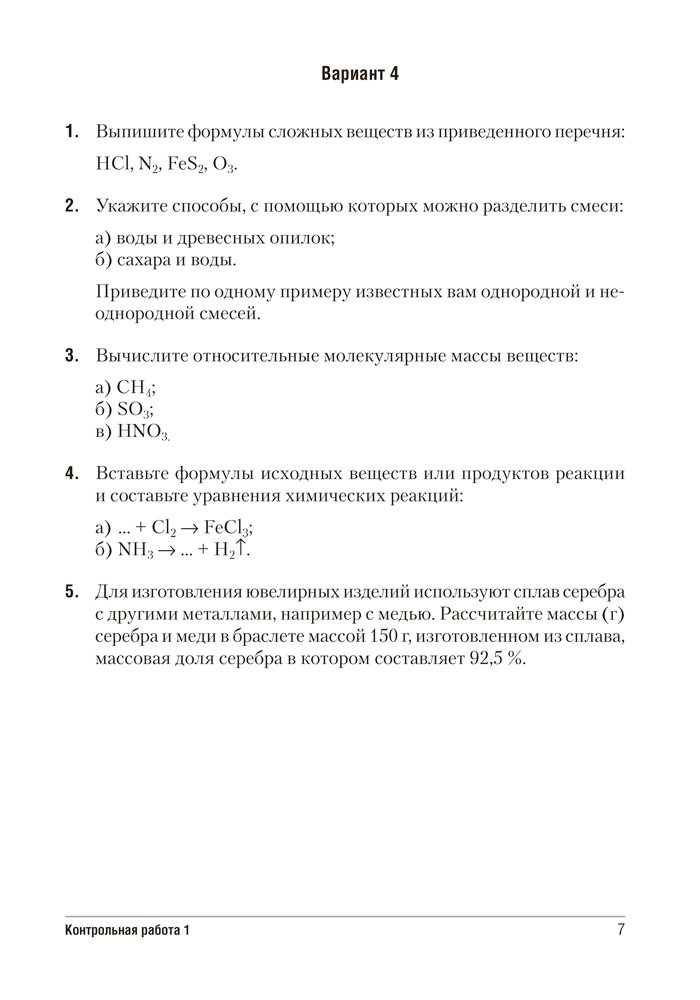 Сборник содержит контрольные и самостоятельные работы по химии для 7 класса, представленные в четырех вариантах. Все варианты включают разноуровневые задания, которые разработаны согласно нормам оценки результатов учебной деятельности учащихся.