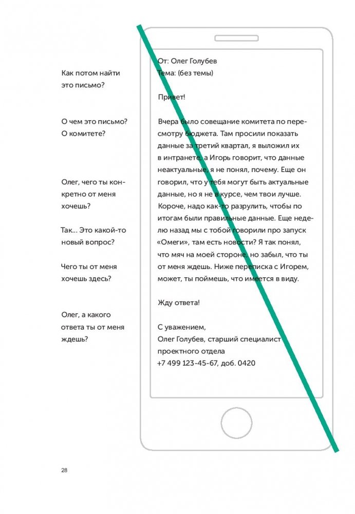 Последние двадцать лет нас учили, что деловая переписка - это бесконечные реверансы, бессмысленные формы вежливости и вымученные шаблоны: "Коллеги, я вас услышал", "Клиент прислал правочки, внесите АСАП. Заранее спасибо", "С уважением к вам и вашему бизнесу". Современное деловое письмо - это махровая фальшь, копеечные манипуляции и плохо скрываемое обоюдное презрение. Максим Ильяхов и Людмила Сарычева, авторы культовой книги "Пиши, сокращай", предлагают менять культуру делового письма и выдвигают два новых правила: уважение к адресату и забота о его интересах. Письма, составленные по таким правилам, располагают к вам людей и помогают находить общий язык. Следуя рекомендациям из книги, вы научитесь писать коммерческие предложения, сопроводительные письма, просьбы коллегам, ответы клиентам и любые другие рабочие письма. Это обязательная книга для всех, кто пишет по работе: руководителей, менеджеров, специалистов и соискателей.