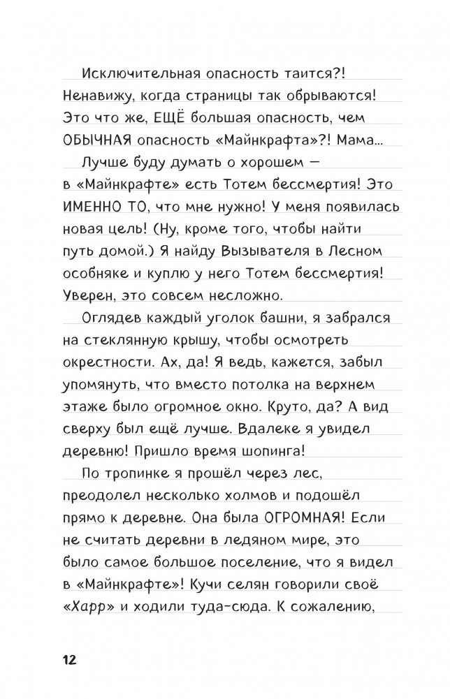 Стиву предстоит разобраться с новыми противниками, найти Тотем бессмертия, научиться нестандартно применять заборы и мастерски овладеть верховой ездой на скелете лошади! Вас ждет море веселья, картинки, а также пространство для творчества, где можно изобрести свой план по спасению Стива или нарисовать любимых персонажей. Стив уже многому научился в "Майнкрафте". Например, что некоторых животных можно приручить, а у селян можно купить что-нибудь полезное. Чего он не ожидал, так это плюющихся домашних животных и селян-монстров, кидающихся на него с топором! По крайней мере, повышенное слюноотделение его новых любимцев не препятствует их пушистой обаятельностью. А вот смертоносность селян-убийц совсем не компенсируется их модными штанишками!
