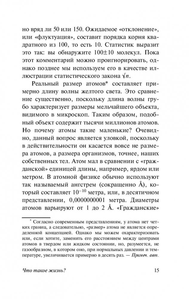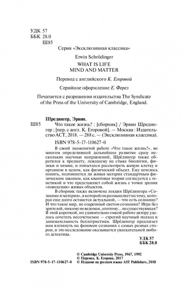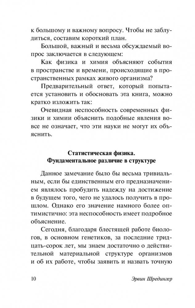 В своей знаменитой работе "Что такое жизнь?", во многом определившей дальнейшее развитие сразу нескольких научных направлений, Шрёдингер также обратился к предмету, лежащему на стыке биологии, физики и химии и попытался рассмотреть живую клетку и организм в целом как физический объект. Ему хотелось понять, подчиняется ли живая материя стандартным физическим законам, как квантовая теория согласуется с генетикой и что представляет собой жизнь с точки зрения "поведения" живых объектов. В сборник также включена лекция Шрёдингера "Сознание и материя", в которой он размышляет на тему, которая еще долго останется актуальной, – что есть сознание? И что такое мир, не озаренный светом сознания? Игра без зрителей, никому не ведомая, а потому не существующая? В этой короткой, но удивительно емкой работе автору удалось сочетать несочетаемое – строгий научный подход и занимательность беллетристики. Шрёдингер предлагает нам взглянуть на феномен сознания с самых разных сторон, и это исследование оказывается увлекательней любого детектива.