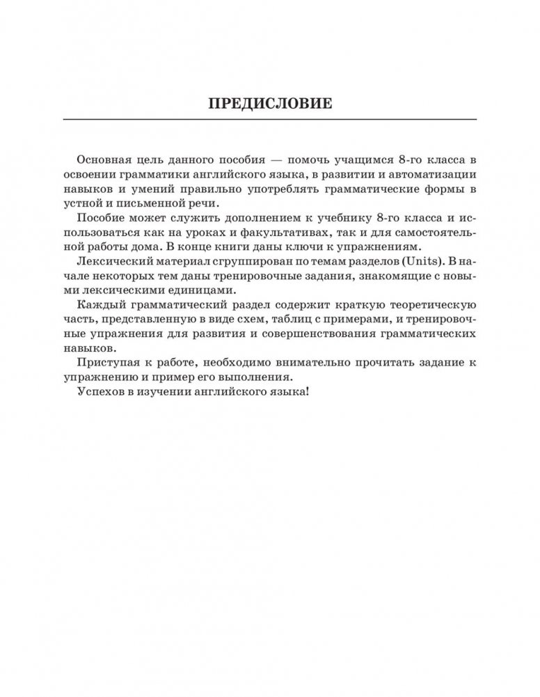 Ваш ребенок приносит плохие оценки по английскому? Тогда эта книга для вас! С ней вы сможете сами, без помощи репетиторов, научить детей читать, писать, легко усваивать сложные правила и другой языковой материал. Основная цель пособия — помочь ученикам 8 класса в освоении грамматики английского языка, способствовать развитию и автоматизации у них навыков чтения, а также умения правильного употребления грамматических форм в устной и письменной речи. Пособие может служить дополнением к учебникам и использоваться как на уроках, факультативах, так и для самостоятельной работы дома. Заниматься по этой книге будет интересно и детям, и родителям, а результат не заставит себя ждать!