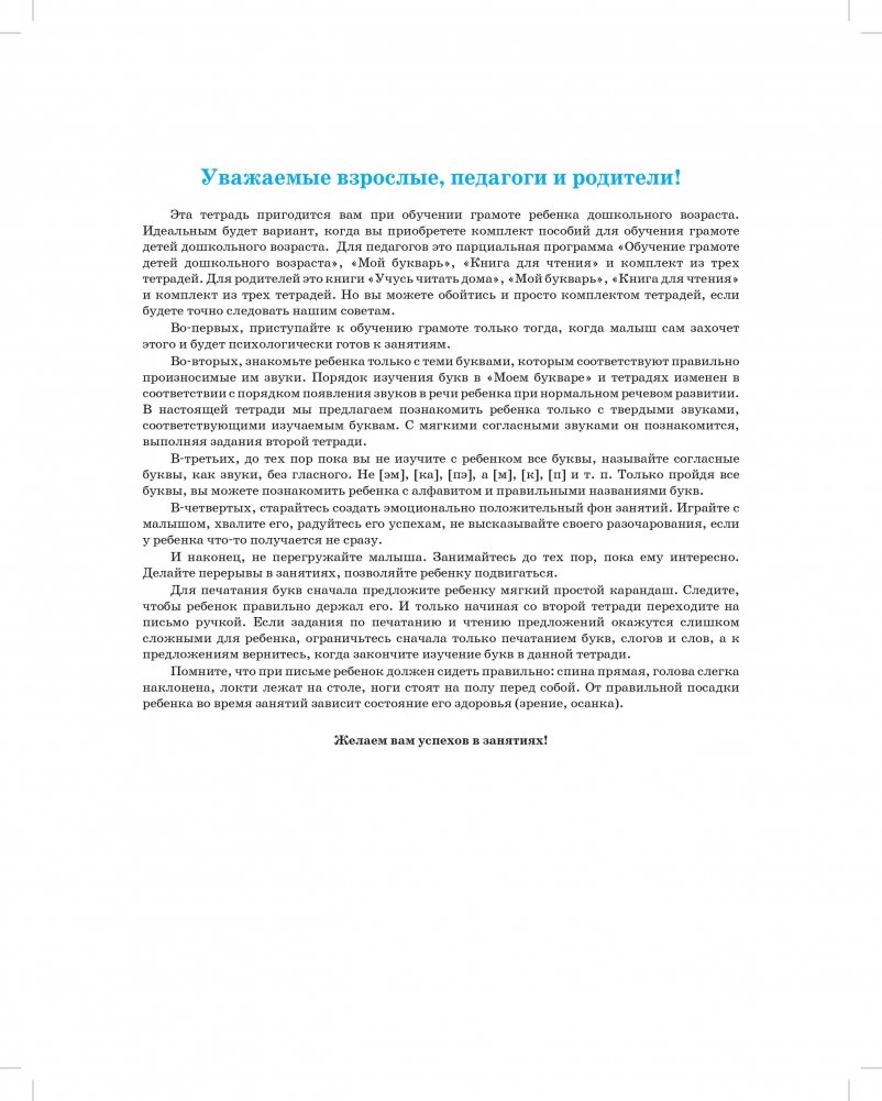 Тетрадь входит в методический комплект парциальной программы «Обучение грамоте детей дошкольного возраста» вместе с книгой «Мой букварь». Задания тетради точно соответствуют первой части «Моего букваря» и дополняют материалы, предложенные в нем для правильного обучения грамоте детей дошкольного возраста. Всего в комплект входят три тетради. Выполняя задания тетрадей под руководством взрослого, ребенок в игровой форме познакомится с буквами русского алфавита, научится читать и печатать слоги, слова, предложения, освоит начала звукового и слогового анализа и синтеза слов, что станет залогом успешного обучения в школе. В тетрадях содержится большое количество заданий для профилактики нарушения письменной речи (дисграфии, дислексии). Комплект тетрадей может использоваться для обучения грамоте детей дошкольного возраста уже с трех лет.