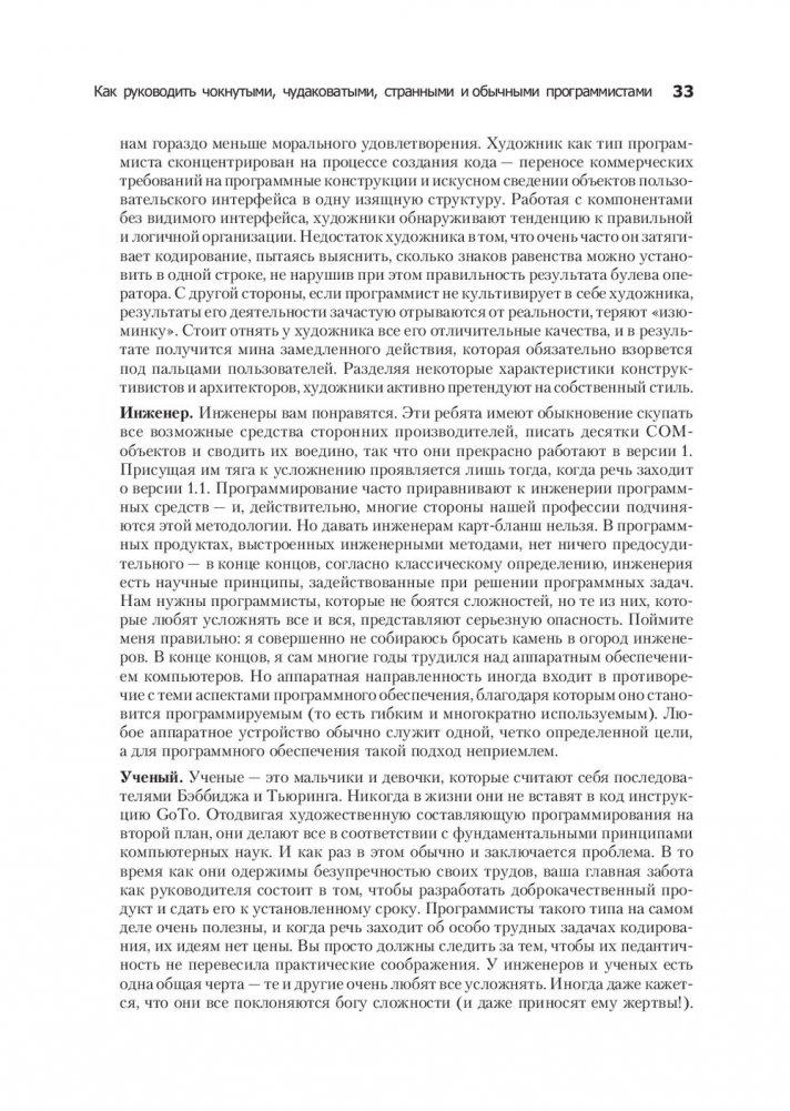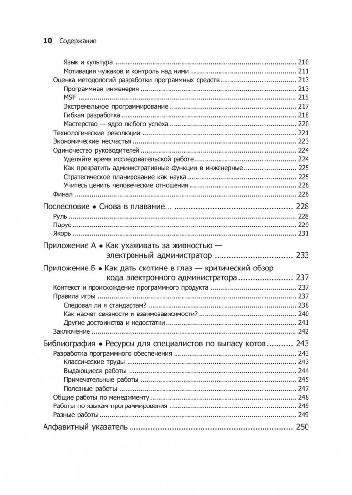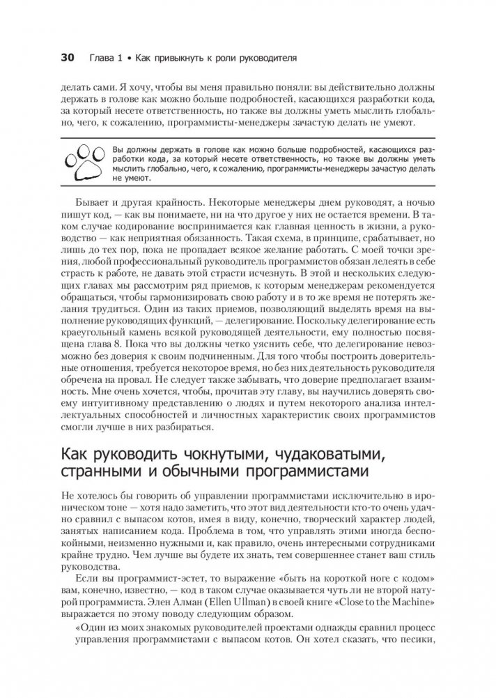 «Как пасти котов» — это книга о лидерстве и руководстве, о том, как первое совмещать со вторым. Это, если хотите, словарь трудных случаев управления IT-проектами. Программист подобен кошке, которая гуляет сама по себе. Так уж исторически сложилось. Именно поэтому так непросто быть руководителем команды программистов. Даже если вы еще месяц назад были блестящим и дисциплинированным программистом и вдруг оказались в роли менеджера, вряд ли вы знаете, с чего надо начать, какой выбрать стиль руководства, как нанимать и увольнять сотрудников, проводить совещания, добиваться своевременного выполнения задач. В таком случае без этой книги вам не обойтись. А может быть, вы — опытный менеджер, желающий пересмотреть свои принципы лидерства? Тогда, опять же, эта книга для вас. Вне зависимости от возраста, пола и социального статуса она поможет вам укрепить свои позиции в роли лидера программистов. Материал изложен довольно компактно и легко укладывается в голове. Стоя в книжном магазине и раздумывая, что же купить, задайте себе один простой вопрос: «Нужно ли мне совершенствовать свои лидерские навыки?» Полагаю, вы ответите: «Да», — а значит, данная книга окажется для вас небесполезной.