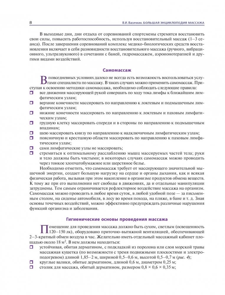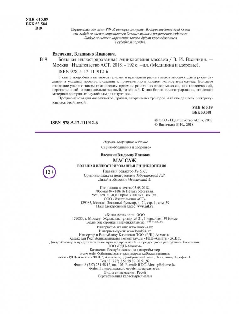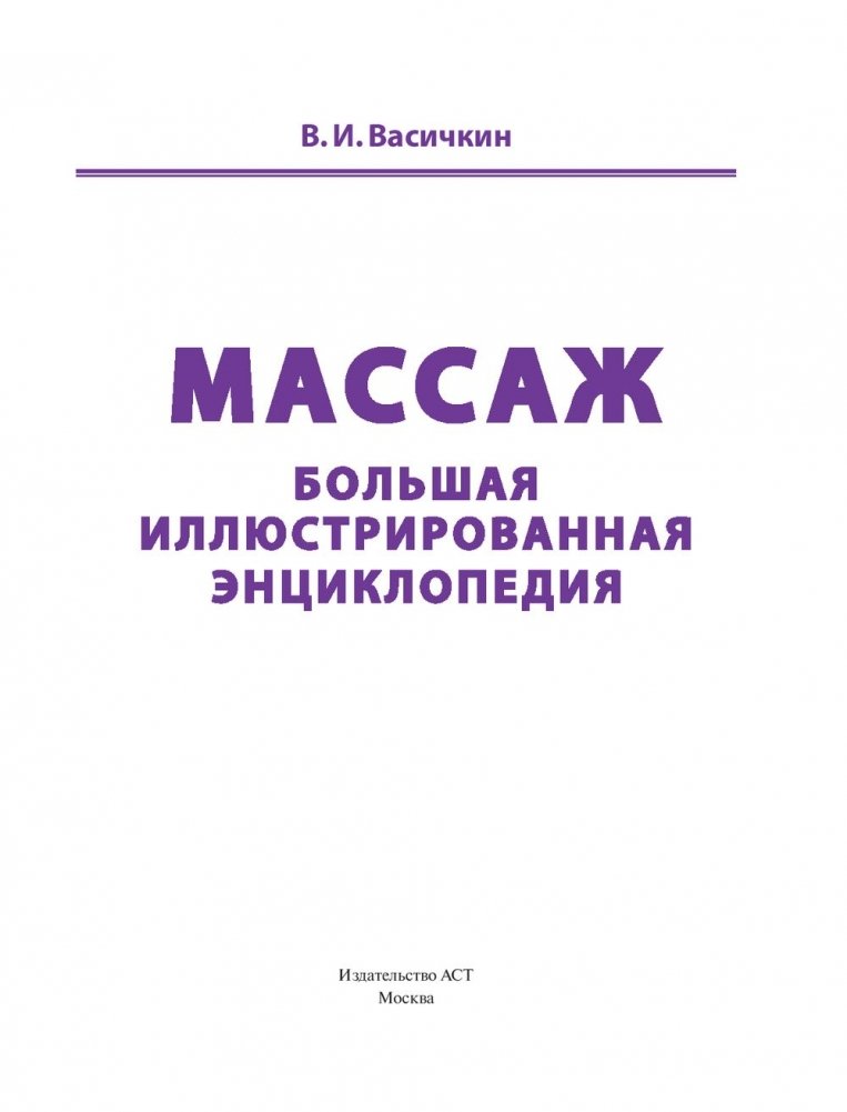 Владимир Иванович Васичкин – признанный эксперт в области массажа и рефлексотерапии. Профессор, автор более десятка научно-популярных книг по медицине, создатель уникальной лечебной методики, он помог миллионам своих читателей сохранить здоровье и красоту. Сила, бодрость, правильная осанка и хорошее настроение каждый день – достичь всего этого помогает искусство массажа. Издавна человек пользовался им, чтобы сохранить крепким и молодым свое тело, снять усталость, облегчить боль, поднять настроение. Лечебный массаж является наиболее распространенным и эффективным немедикаментозным методом лечения. В этой книге представлены такие практики, как точечный, сегментарный, гигиенический, спортивный и ряд других методов массажа. Специальные техники помогут выздоравливающим быстрее оправиться от ожогов, ушибов и переломов. В книгу включено около 300 иллюстраций, на которых наглядно изображены биологически-активные точки и направление движения рук при выполнении массажа. Иллюстрированная энциклопедия станет незаменимым помощником в работе профессионалов, а широкому читателю поможет освоить технику самомассажа.