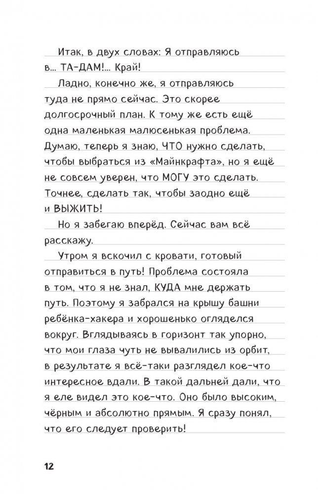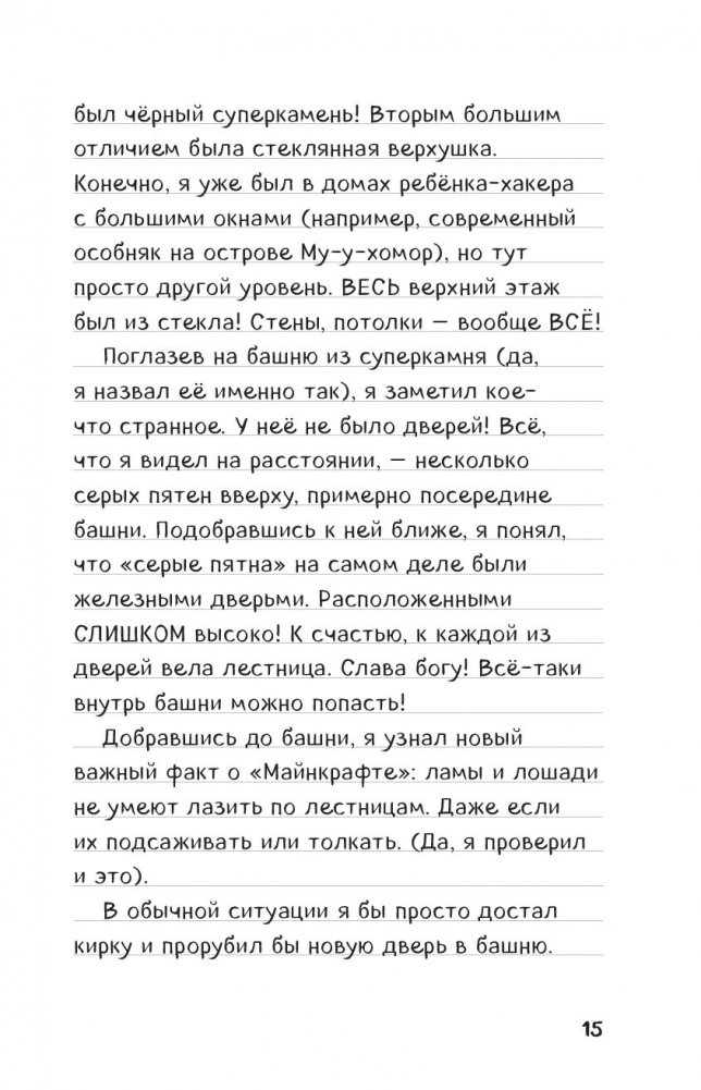 Стив снова оказывается в мире Лесного особняка, а потом - отправиться на поиски новой летающей книги (старая - не сработала, увы) и очей Края. А еще он приручит нового питомца! Вас ждет море веселья, картинки, а также пространство для творчества, где можно изобрести свой план по спасению Стива или нарисовать любимых персонажей. Стив наконец узнал, как попасть домой! Ему предстоит опасное путешествие и смертельная схватка… Но это, скорее, план на отдалённое будущее. К такому приключению надо как следует подготовиться! Поэтому читатель вместе со Стивом, его ламами и лошадью-скелетом отправятся покорять мир Лесного особняка… во второй раз. Увы-увы, летающая книга не сработала, поэтому нам предстоит отправиться в путь на поиски новой книги и очей Края! Стив придумает 6 способов заставить очи Края НЕ работать, приручит нового необычного и очень полезного питомца и придумает, как отнять у зомби-воришки, затерявшегося в лесу, око Края. Внутри книги есть пространство для творчества, где читатель может рисовать и помогать Стиву!