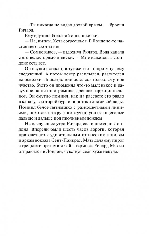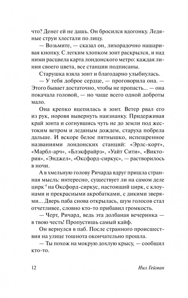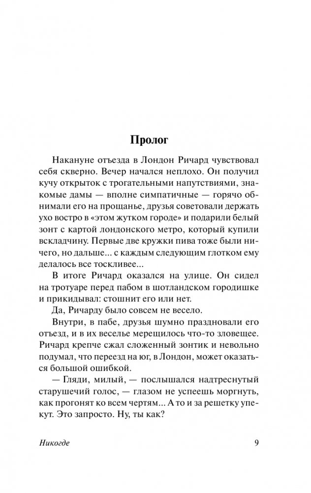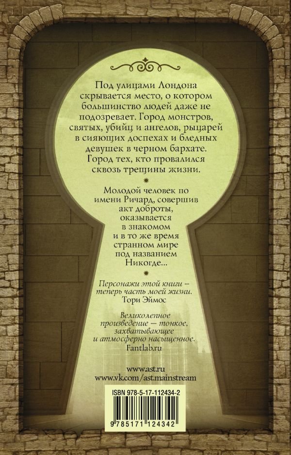 Под Лондоном скрывается место, о котором большинство людей даже не подозревает. Город монстров, святых, убийц и ангелов, рыцарей в сияющих доспехах и бледных девушек в черном бархате. Город тех, кто провалился сквозь трещины жизни. Молодой человек по имени Ричард, совершив акт доброты, оказывается в знакомом и в то же время странном мире под названием Никогде…