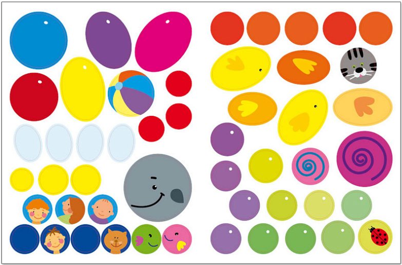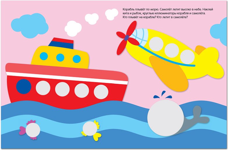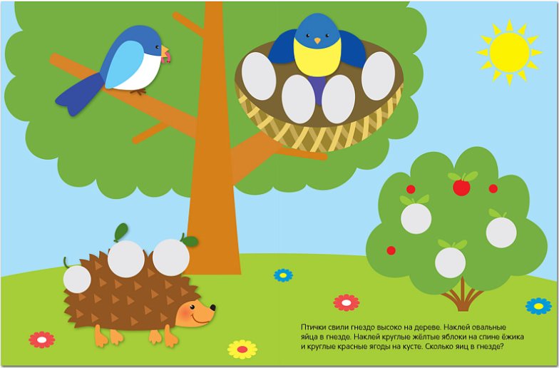 Дополнять красочные картинки наклейками (в самолет нужно наклеить круглые иллюминаторы; в птичье гнездо — овальные яички, на яблоню — круглые яблоки и т. д.) не только весело, но и полезно. Это занятие способствует развитию речи, интеллекта, мелкой моторики, координации движений, умения находить и принимать решения; расширяет представления об окружающем мир