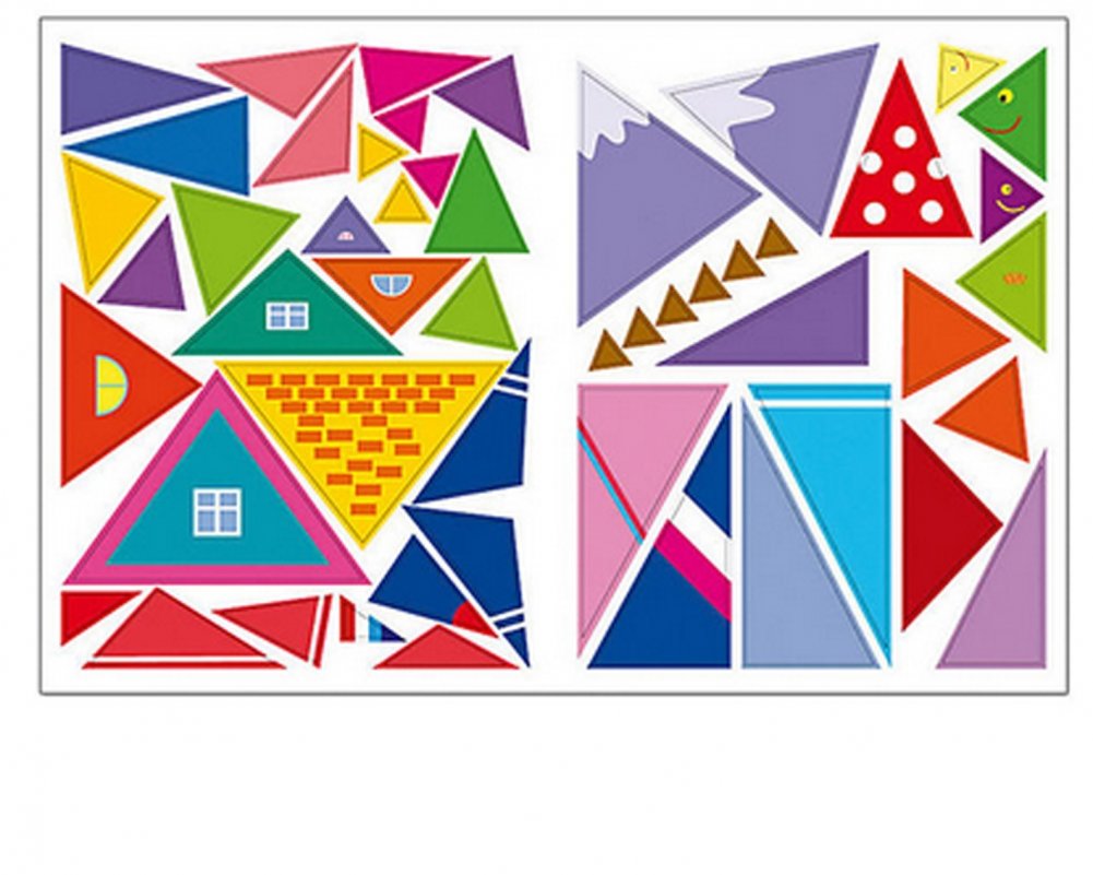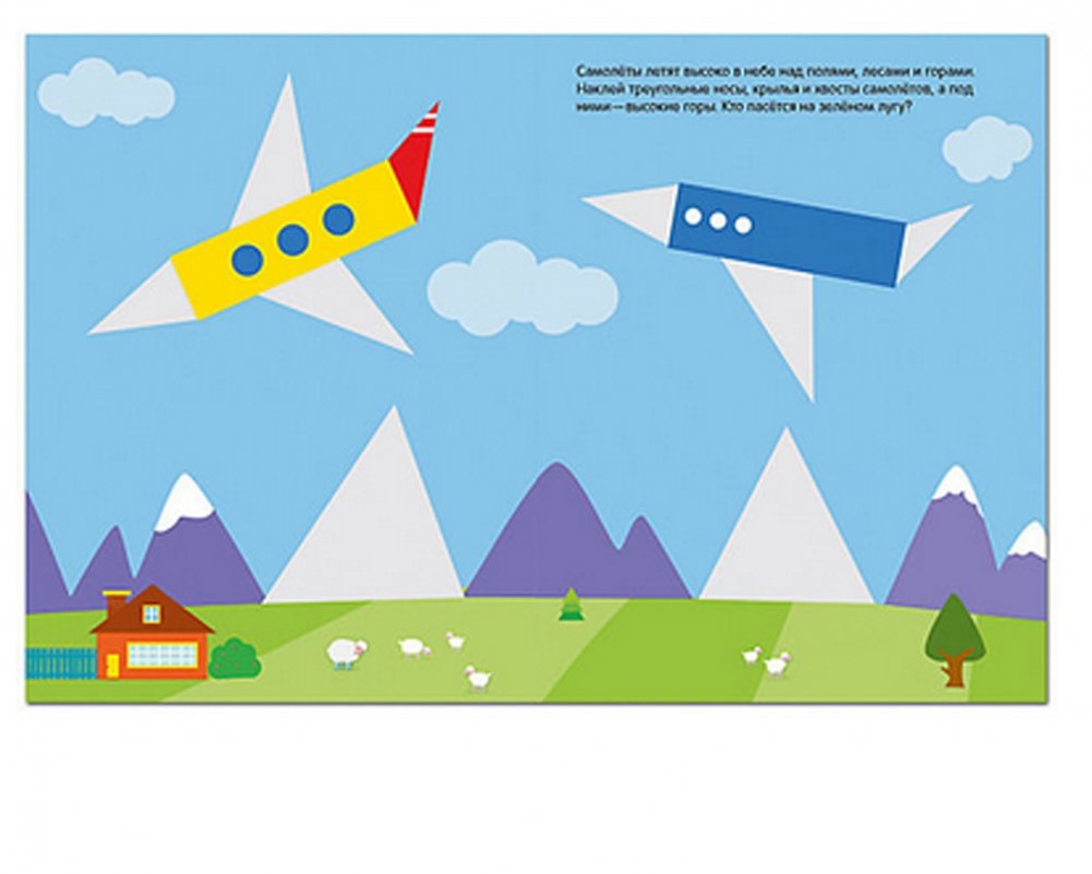Дополнять красочные картинки наклейками (наклеивать треугольные крыши домов, верхушки елок, горы, паруса лодок и т.д.) не только весело, но и полезно. Это занятие способствует развитию речи, интеллекта, мелкой моторики, координации движений, умения находить и принимать решения; расширяет представления об окружающем мире.