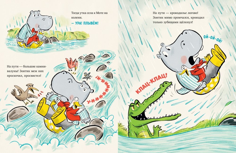 «Утя и Мотя» – закадычные друзья, несмотря на то, что они такие разные! Утя – веселая, озорная утка, а Мотя – осторожный и неповоротливы бегемот. Как-то раз Утя пригласила Мотю на необычную прогулку – прогулку под дождем! Зонтик у друзей всего один, но это не беда. Они прыгают по лужам и даже придумали поплавать в перевернутом зонтике по реке. Это оказалось не так-то просто, Утю и Мотю поджидали самые настоящие и иногда даже опасные приключения. Но, когда друзья вместе, им все по плечу.