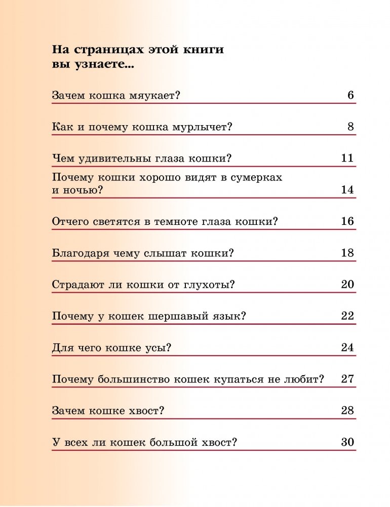 Страницы этой книги познакомят юных читателей с тайнами наших домашних питомцев – кошек. Дед Природовед расскажет, зачем кошки мяукают, как и почему они это делают. Вы узнаете, чем удивительны глаза кошек и почему кошки хорошо видят в сумерках и ночью. А также, почему светятся в темноте глаза кошек, отчего у кошки шершавый язык, почему большинство кошек купаться не любят? Почему кошки трутся о ноги людей? Зачем врачи советуют пациентам слушать мурлыканье? Где можно посетить Музей кошки и где кошкам установлены памятники?