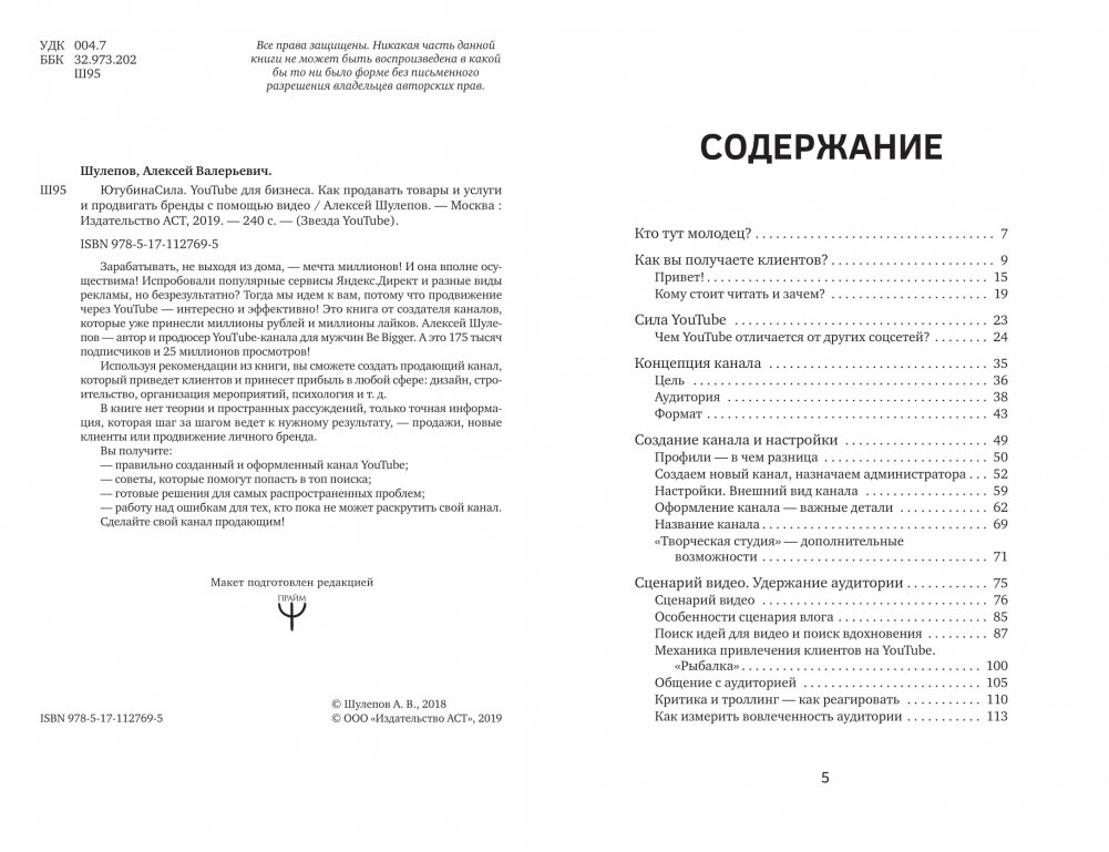 Зарабатывать, не выходя из дома — мечта миллионов! И она вполне исполнима! Испробовали популярные сервисы Яндекс.Директ и разные виды рекламы, но безрезультатно? Тогда мы идем к вам, потому что продвижение через YouTube — интересно и эффективно! Это книга от создателя каналов, которые уже принесли миллионы рублей и миллионы лайков. Алексей Шулепов — автор и продюсер YouTube-канала для мужчин Be Bigger. А это 175 тысяч подписчиков и 25 миллионов просмотров! Используя рекомендации из книги, вы сможете создать продающий канал, который приведет клиентов и принесет прибыль в любой сфере: дизайн, строительство, организация мероприятий, психология и т. д. В книге нет теории и пространных рассуждений, только точная информация, которая шаг за шагом ведет к нужному результату — продажи, новые клиенты или продвижение личного бренда. Вы получите: — правильно созданный и оформленный канал YouTube; — советы, которые помогут попасть в топ поиска; — готовые решения для самых распространенных проблем; — работу над ошибкам для тех, кто пока не может раскрутить свой канал.