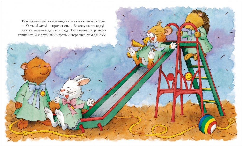 Серия книг про смешного и обаятельного мышонка Тима поможет малышам понимать, признавать и называть свои чувства, научиться общаться со сверстниками и справляться с трудными ситуациями. В этой книге мышонок Тим узнает, что в детском саду весело и интересно.