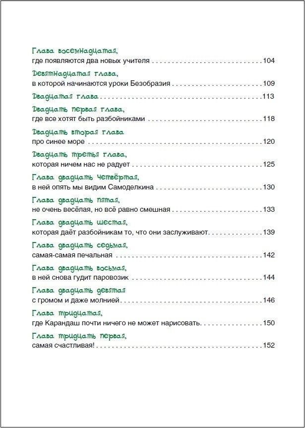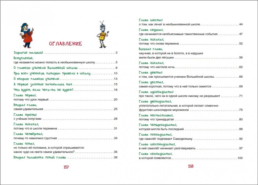 Есть на свете удивительная школа, в которой проходят уроки Фантазии, Смеха и Радости, Доброты, Стуканья-Бряканья и Необыкновенных Путешествий. В классах этой школы много разных игрушек, а вместо парт нарядные деревянные лошадки с мягкими сёдлами. По коридорам здесь гуляют коза с васильками и ромашками на боках, зелёный кот и собака с тигровыми полосками. А открыли эту замечательную школу волшебный художник Карандаш, рисунки которого мгновенно оживают, и железный человечек Самоделкин, который может смастерить любой, даже самый сложный механизм.