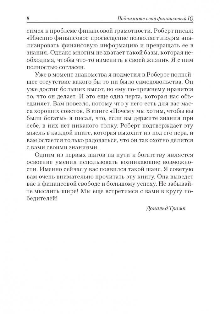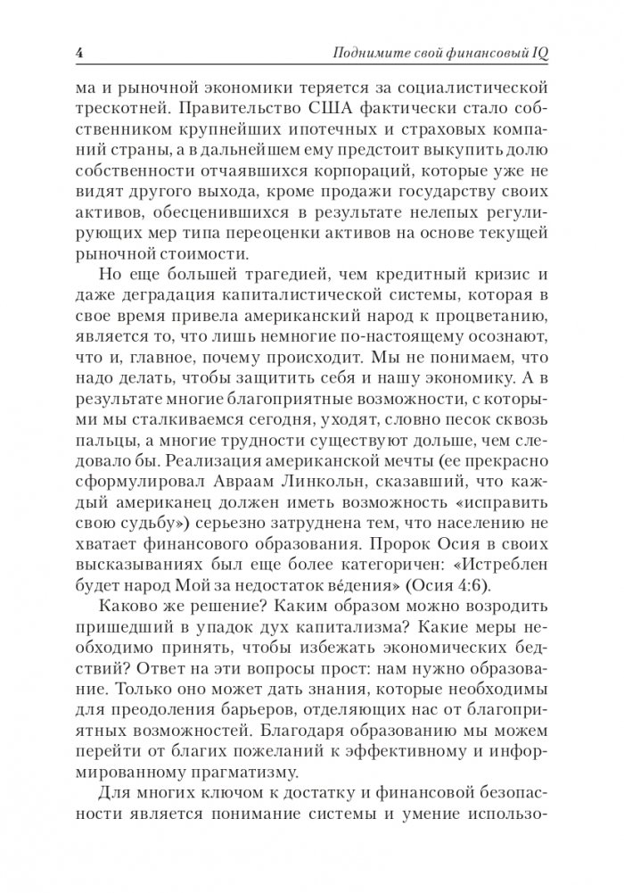 Эта книга не дает финансовых рекомендаций и магических формул. Это не пособие по быстрому обогащению. Роберт не подскажет вам, что именно вы должны делать. Его цель — дать каждому читателю финансовые знания, которые позволят вам найти свой путь к достижению материального благосостояния. Иными словами, повысить ваш финансовый IQ. Здесь излагаются новые правила обращения с деньгами, которые изменились уже много лет назад. Но чтобы их освоить, вам необходимо поднять свой уровень финансовой подготовки.