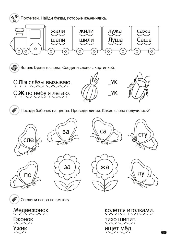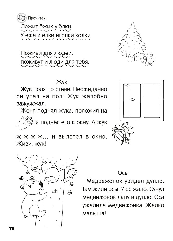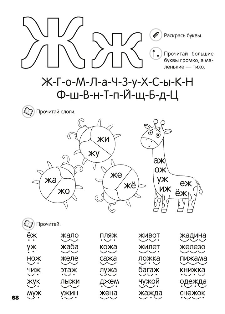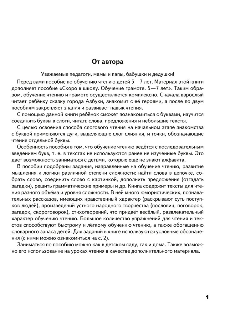 Книга познакомит детей с буквами, научит соединять буквы в слоги, читать слова, предложения и небольшие тексты, а также подготовит к курсу «Обучение чтению» в школе. Увлекательные задания, которые можно выполнять на страницах пособия, помогут в развитии речи, мышления, внимания, памяти, воображения, а также координации движений рук и мелкой моторики.