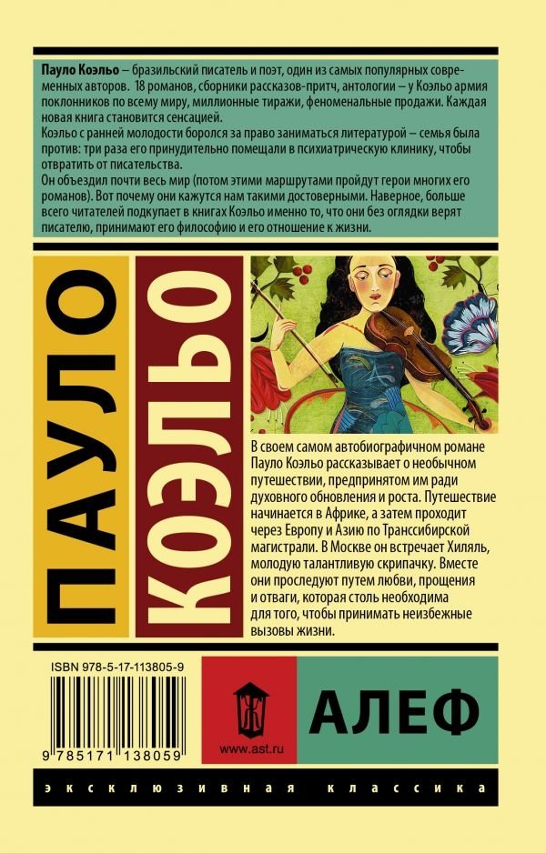 В каждое мгновение жизни что-то начинается заново. Решать. Меняться. Стремиться вперед. Мыслить. Принимать вызовы. Отказываться от стереотипов. Достигать. Мечтать. Открывать. Верить. Останавливаться. Слушать себя. Расти. Побеждать. Смотреть на жизнь открытыми глазами. В своем самом автобиографичном романе Пауло Коэльо рассказывает о необычном путешествии, предпринятом им ради духовного обновления и роста. Путешествие начинается в Африке, а затем проходит через Европу и Азию по Транссибирской магистрали. В Москве он встречает Хиляль, молодую талантливую скрипачку. Вместе они проследуют путем любви, прощения и отваги, которая столь необходима для того, чтобы принимать неизбежные вызовы жизни. "Алеф" призывает нас к действию. Наступает день, когда необходимо заново осмыслить нашу жизнь, понять, находимся ли мы там, куда стремимся, и получается ли у нас делать то, что мы хотим. Одни книги мы читаем, а другие - проживаем, как "Алеф".