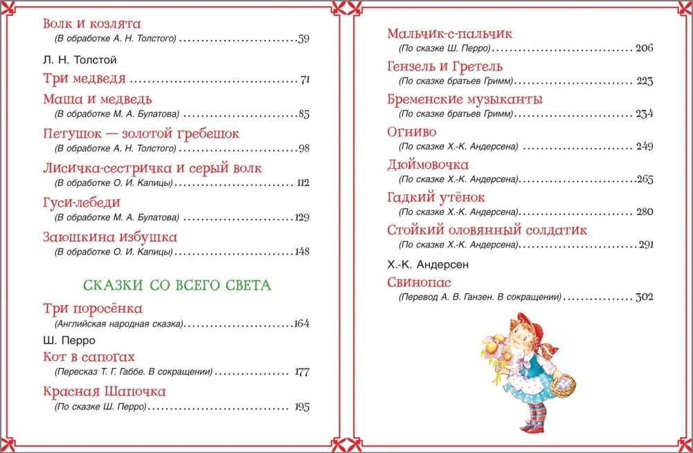 В сборник вошли самые известные и любимые русские народные сказки: «Репка», «Колобок», «Теремок», а также произведения великих сказочников: Шарля Перро, Ханса Кристиана Андерсен и братьев Гримм. Эти забавные, трогательные и поучительные истории непременно понравятся малышам.