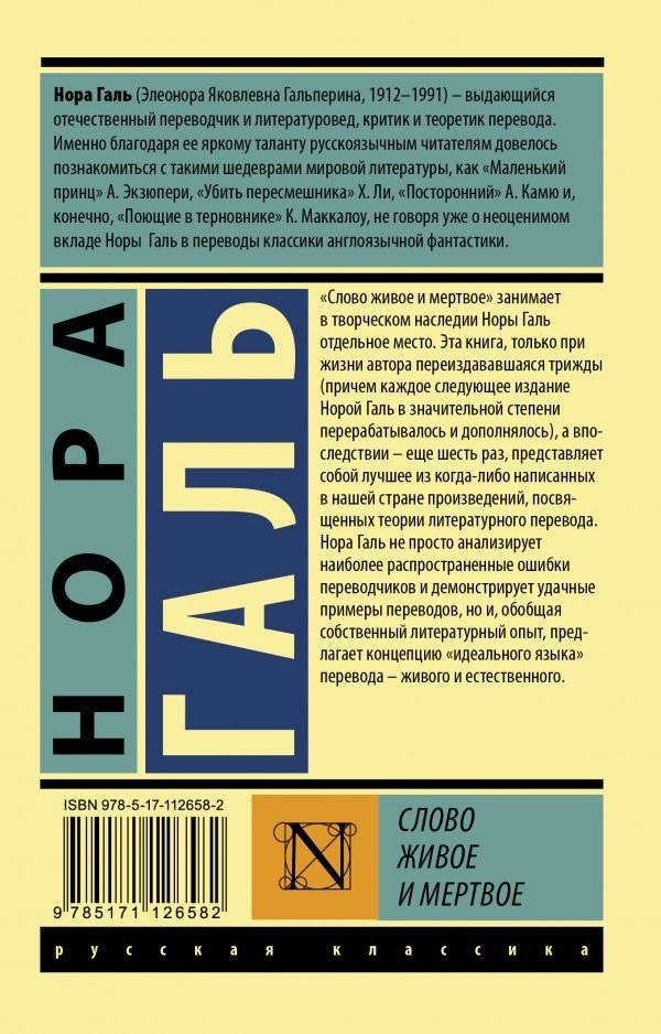 "Слово живое и мертвое" занимает в творческом наследии Норы Галь отдельное место. Эта книга, только при жизни автора переиздававшаяся трижды (причем каждое следующее издание Норой Галь в значительной степени перерабатывалось и дополнялось), а впоследствии – еще шесть раз, представляет собой лучшее из когда-либо написанных в нашей стране произведений, посвященных теории литературного перевода. Нора Галь не просто анализирует наиболее распространенные ошибки переводчиков и демонстрирует удачные примеры переводов, но и, обобщая собственный литературный опыт, предлагает концепцию "идеального языка" перевода – живого и естественного.
