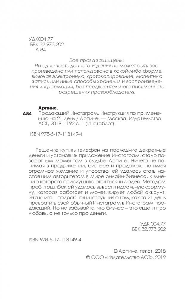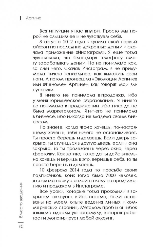 Решение купить телефон на последние декретные деньги и установить приложение Инстаграм, стало поворотным моментом в судьбе Арпине. Ничего не понимая в продвижении, бизнесе и продажах, но имея огромное желание и упорство, ей удалось стать настоящим авторитетом в мире онлайн-бизнеса, к мнению которого прислушиваются тысячи людей. Методом проб и ошибок ей удалось вывести идеальную формулу, которая работает и монетизирует любой аккаунт. Эта книга – подробная инструкция о том, как за 21 день превратить свой обычный Инстаграм в Инстаграм продающий. Но не забывайте, что бизнес – это еще и про любовь, а не только про деньги.