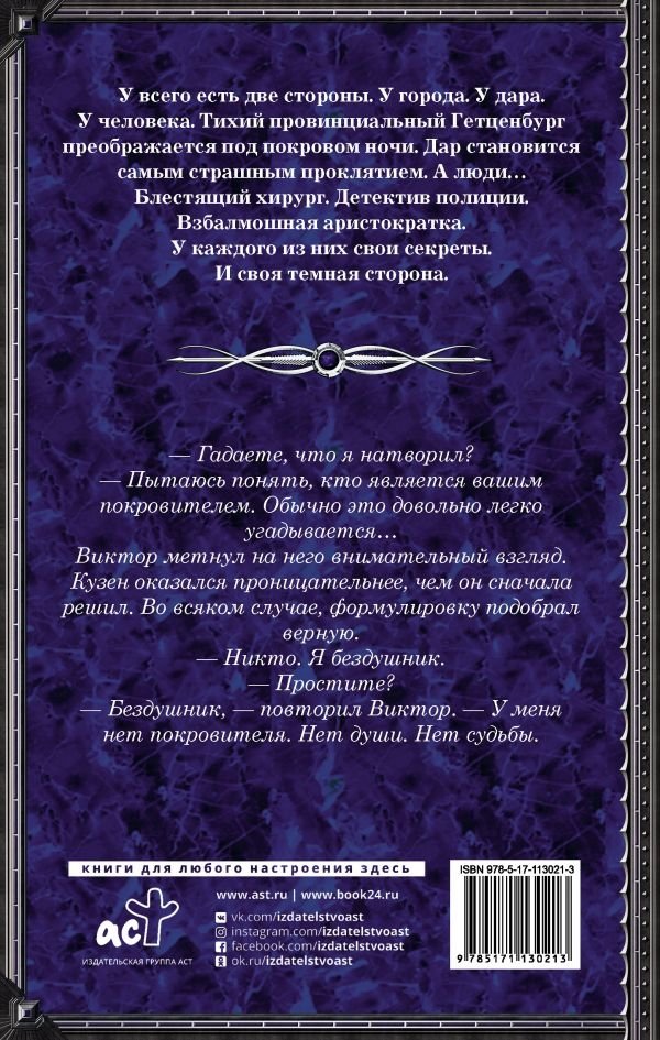 У всего есть две стороны. У города. У дара. У человека. Тихий провинциальный Гетценбург преображается под покровом ночи. Дар становится самым страшным проклятием. А люди… Блестящий хирург. Детектив полиции. Взбалмошная аристократка. У каждого из них свои секреты. И своя темная сторона.