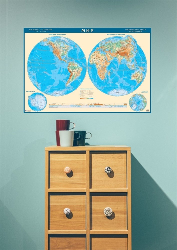 Физическая карта полушарий мира. Настенная карта с антибликовой ламинацией