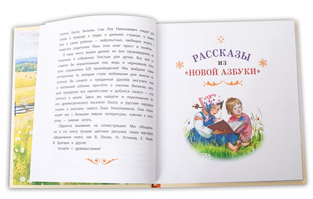 В книге собраны произведения для детей, вошедшие в "Азбуку", "Новую азбуку" и "Русские книги для чтения". Иллюстрации таких мастеров оформления книги, как В. Лосин, Н. Устинов, Е. Рачев и другие, прекрасно дополняют тексты.