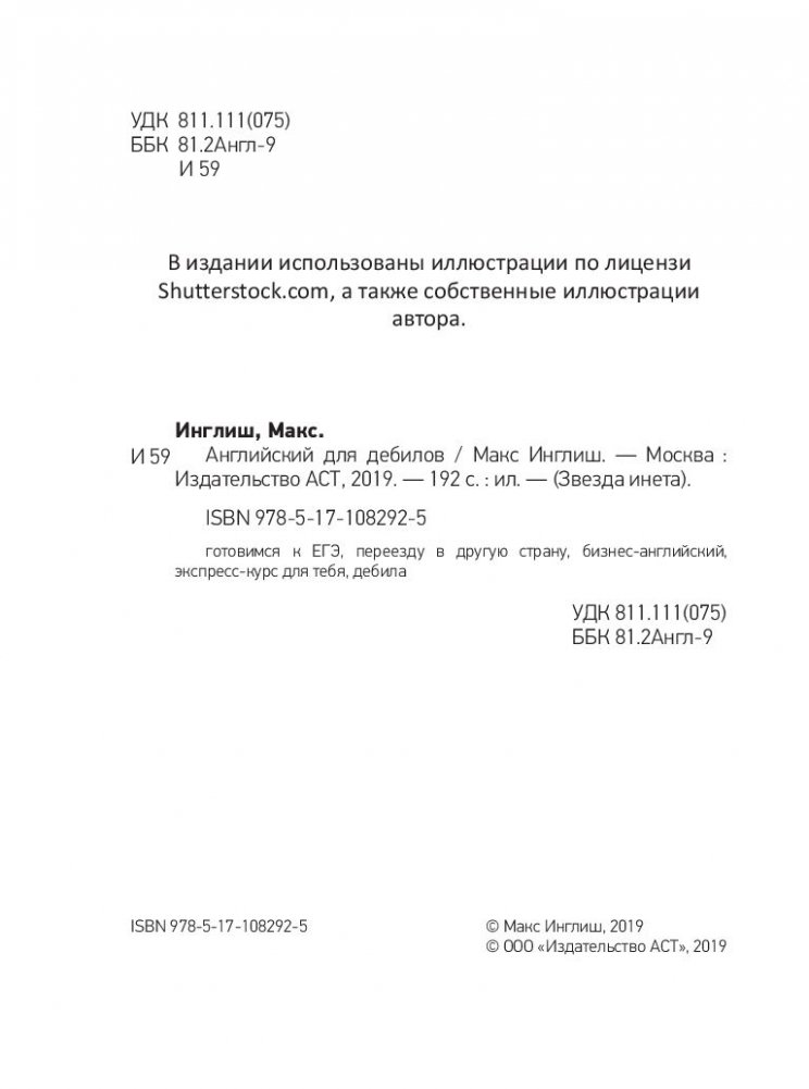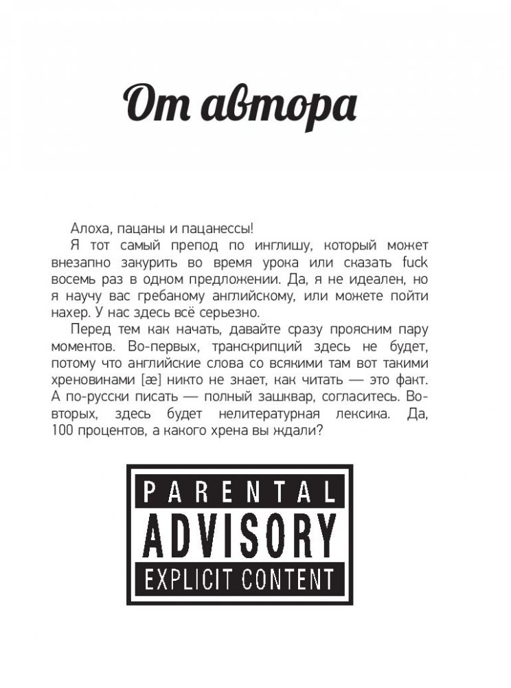 Привет! Меня зовут Макс Инглиш, я автор и создатель телеграм-канала "Английский для дебилов" и этой книги. Если вы не лишены чувства юмора и самоиронии, читайте эту книгу. Если вы ханжа и никогда не говорите даже слова "фигня", листайте дальше, омг: в книге встречается нелитературная лексика. "Какого хрена?" — спросите вы? А вот так!