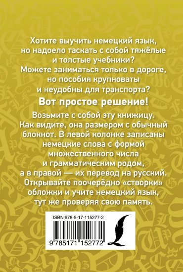 Как легко и быстро запомнить немецкие слова, не тратя на это слишком много времени? Это компактное пособие размером с блокнот — отличное решение. В небольшой книжке — самые нужные слова по основным темам. Пособие устроено таким образом, что открывая поочередно "створки обложки", можно запоминать слова и тут же проверять свою память.