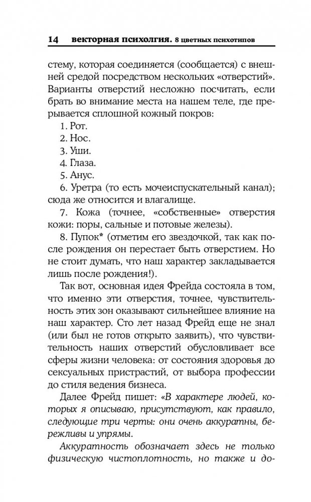 В начале прошлого века Зигмунд Фрейд предположил, что характер человека как-то связан с чувствительными отверстиями на нашем теле (рот, нос, ухо, глаз и другие). Сто лет назад Фрейд еще не знал или был не готов открыто заявить, что чувствительность этих отверстий обусловливает все сферы жизни человека: от состояния здоровья до сексуальных пристрастий, от выбора профессии до стиля ведения бизнеса. Из этой книги вы узнаете, какие существуют типы людей в зависимости от ведущей чувствительной зоны, и как могут помочь эти знания в различных ситуациях вашей жизни. В увлекательных и порой смешных историях автор рассказывает о психологических инструментах, которые вы сможете применять для построения гармоничных отношений с детьми и родителями, близкими и незнакомыми людьми, в бизнесе и в личной жизни.