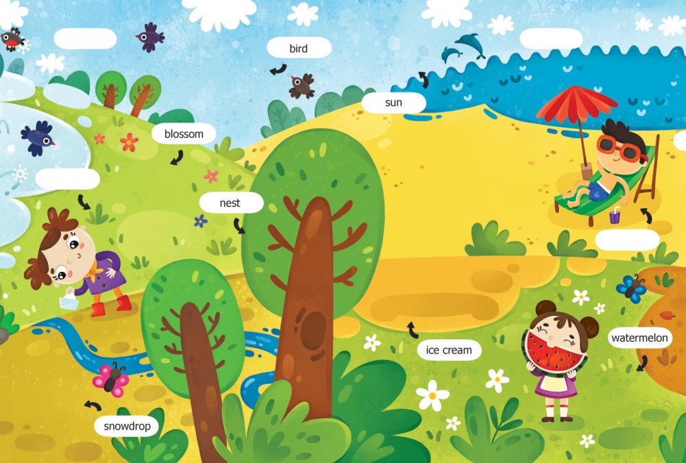 Первые слова. Английский язык. Времена года. Обучающая книжка с наклейками