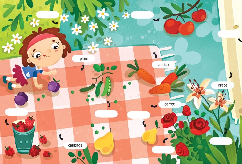 Первые слова. Английский язык. Что растет в моем саду? Обучающая книжка с наклейками